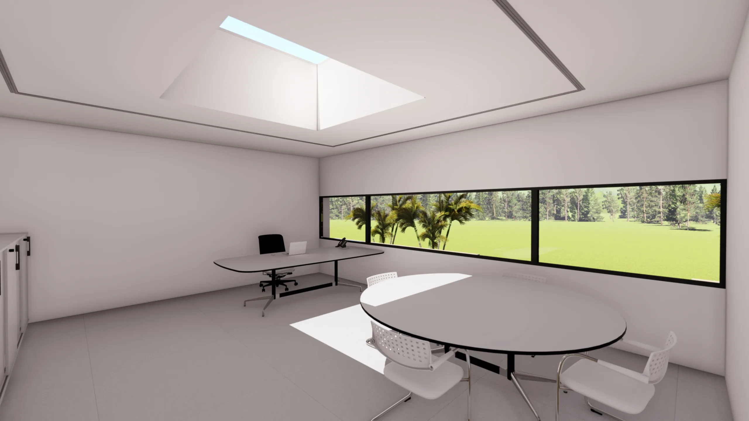 El acceso se produce a través de un primer volumen que acoge el garaje para dos vehículos y, sobre él, un estudio sereno, perfecto para trabajar inmerso en la calma del entorno.