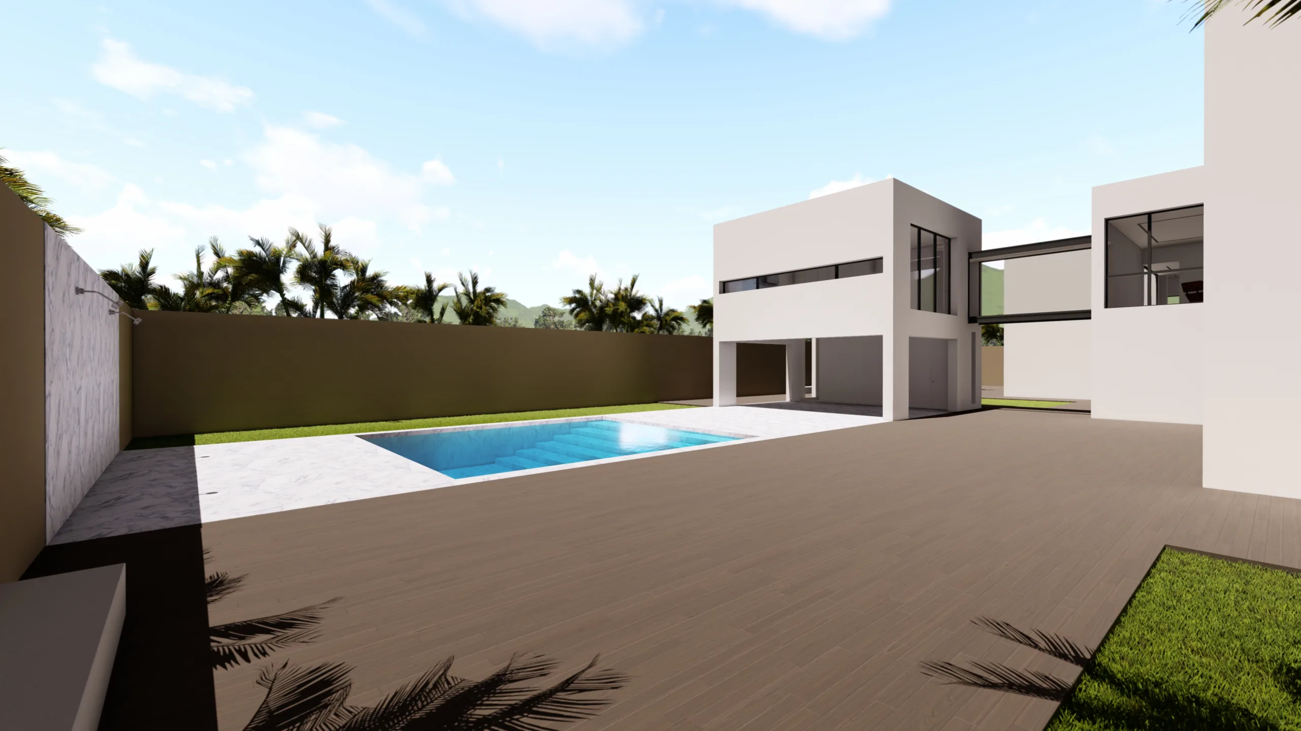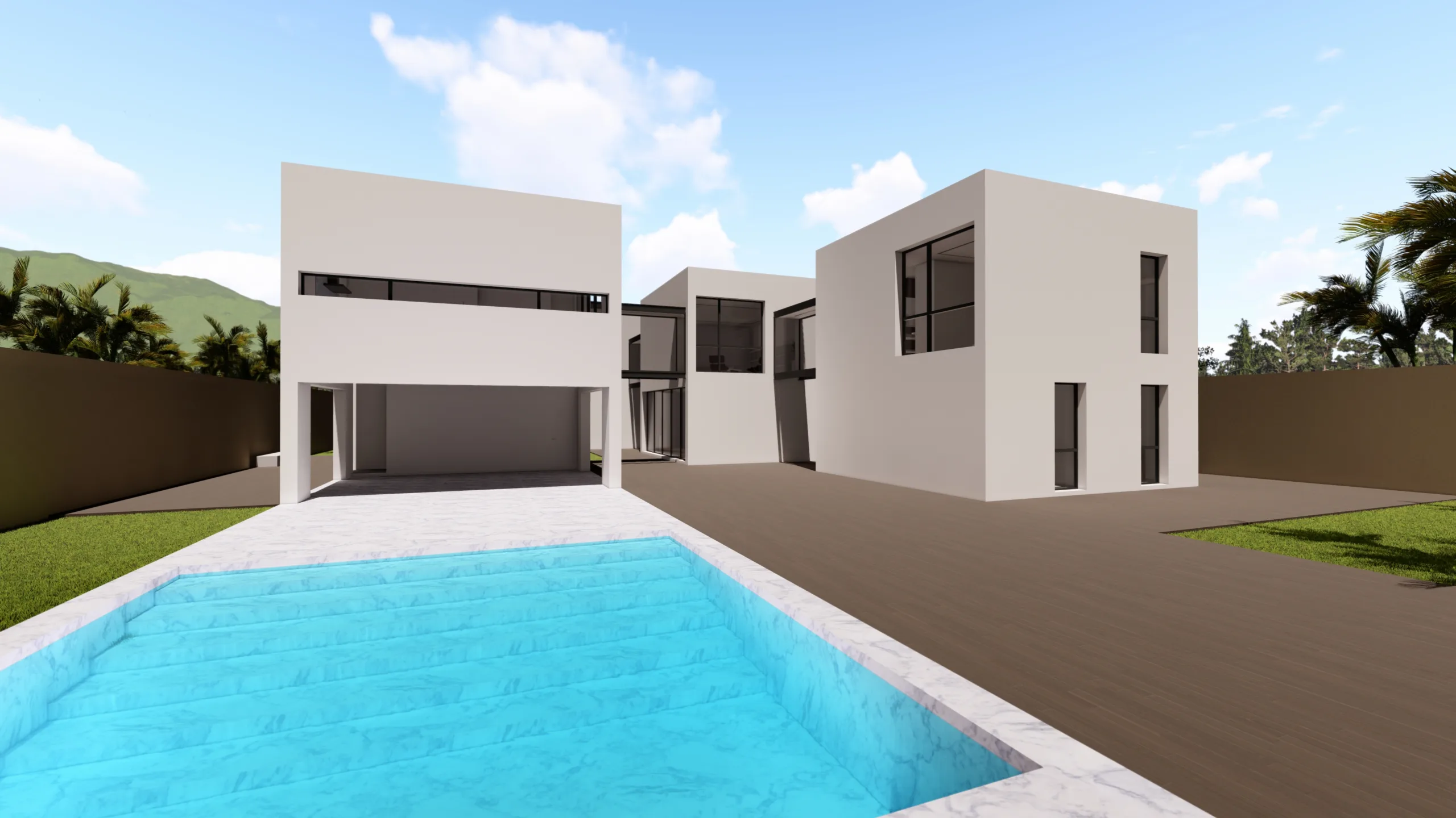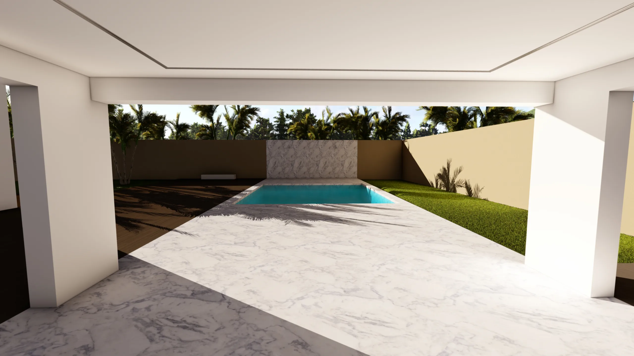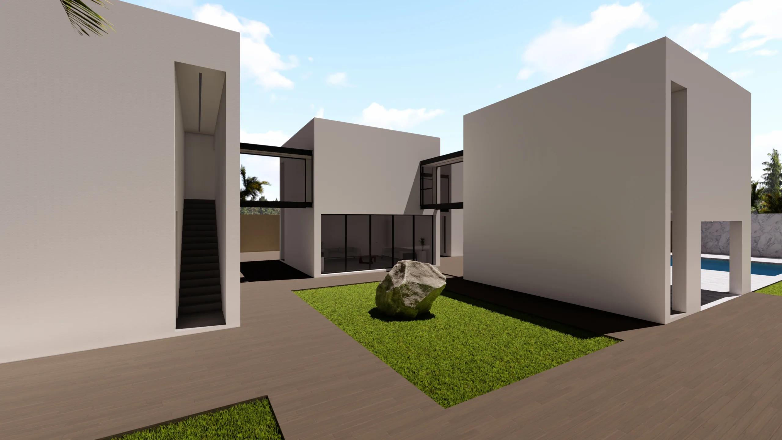 El tercer cubo es pura transición: un porche cubierto y abierto en tres de sus caras invita a extender la vida hacia el jardín y la piscina, acompañado de un aseo lateral discreto.