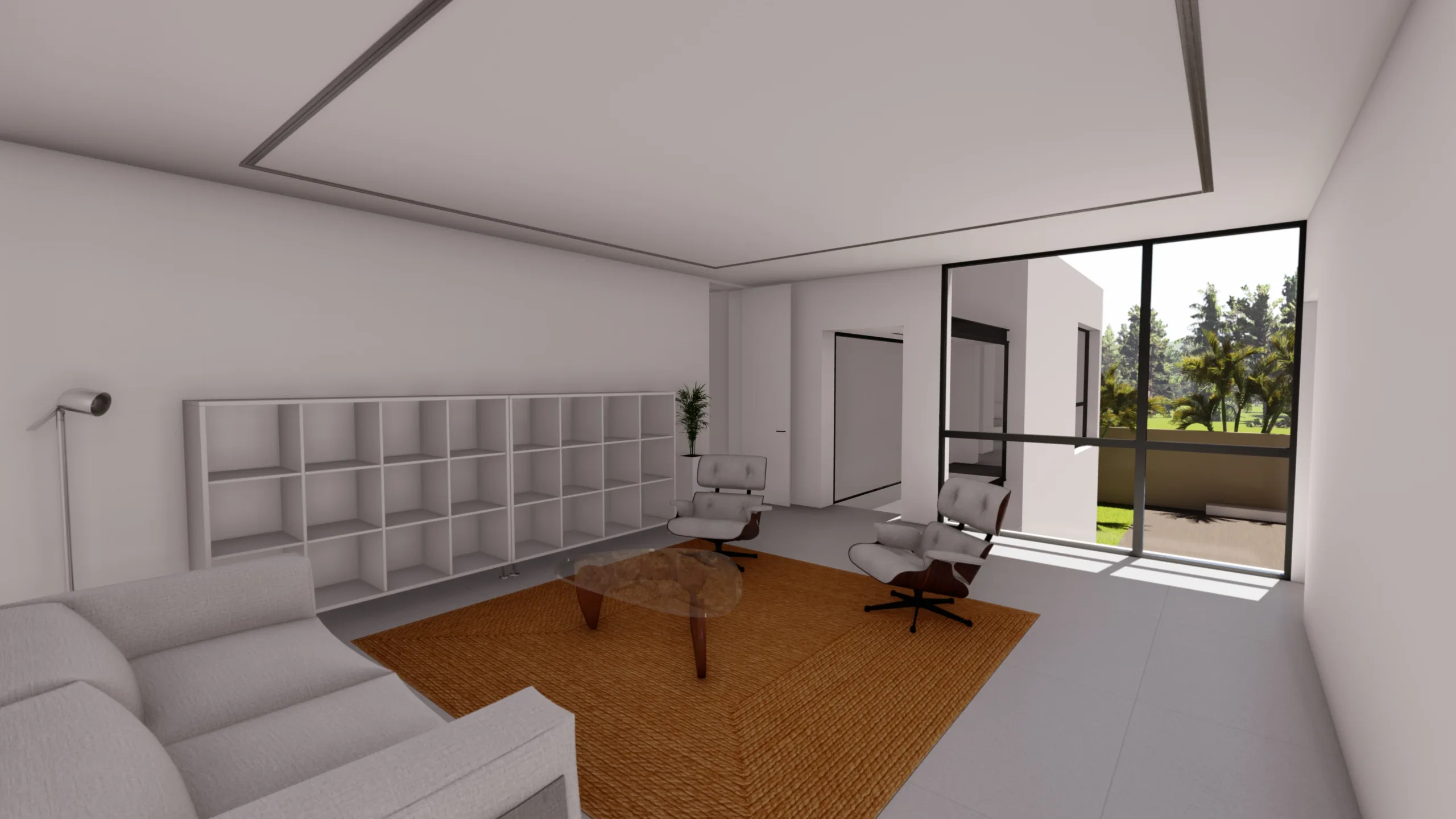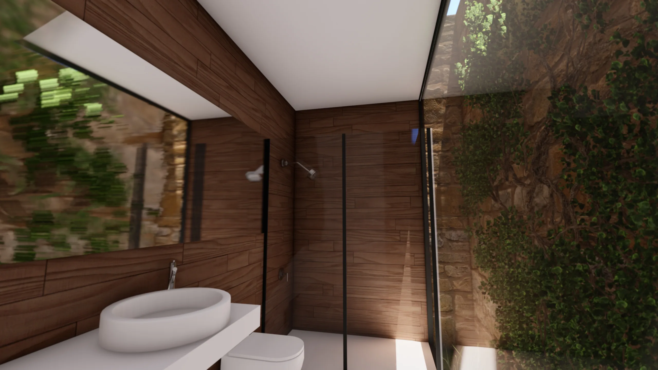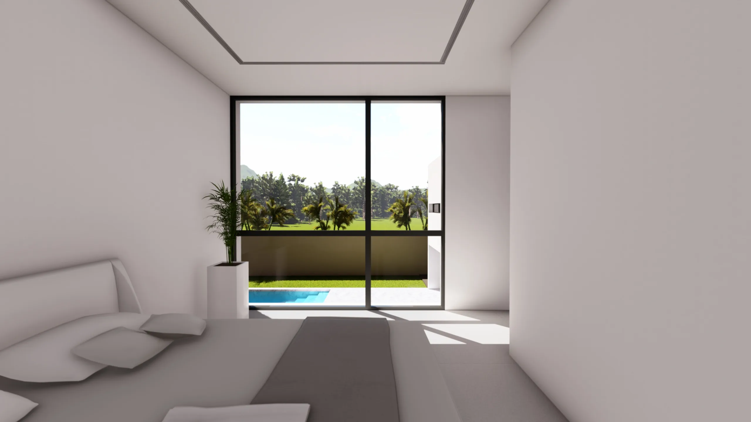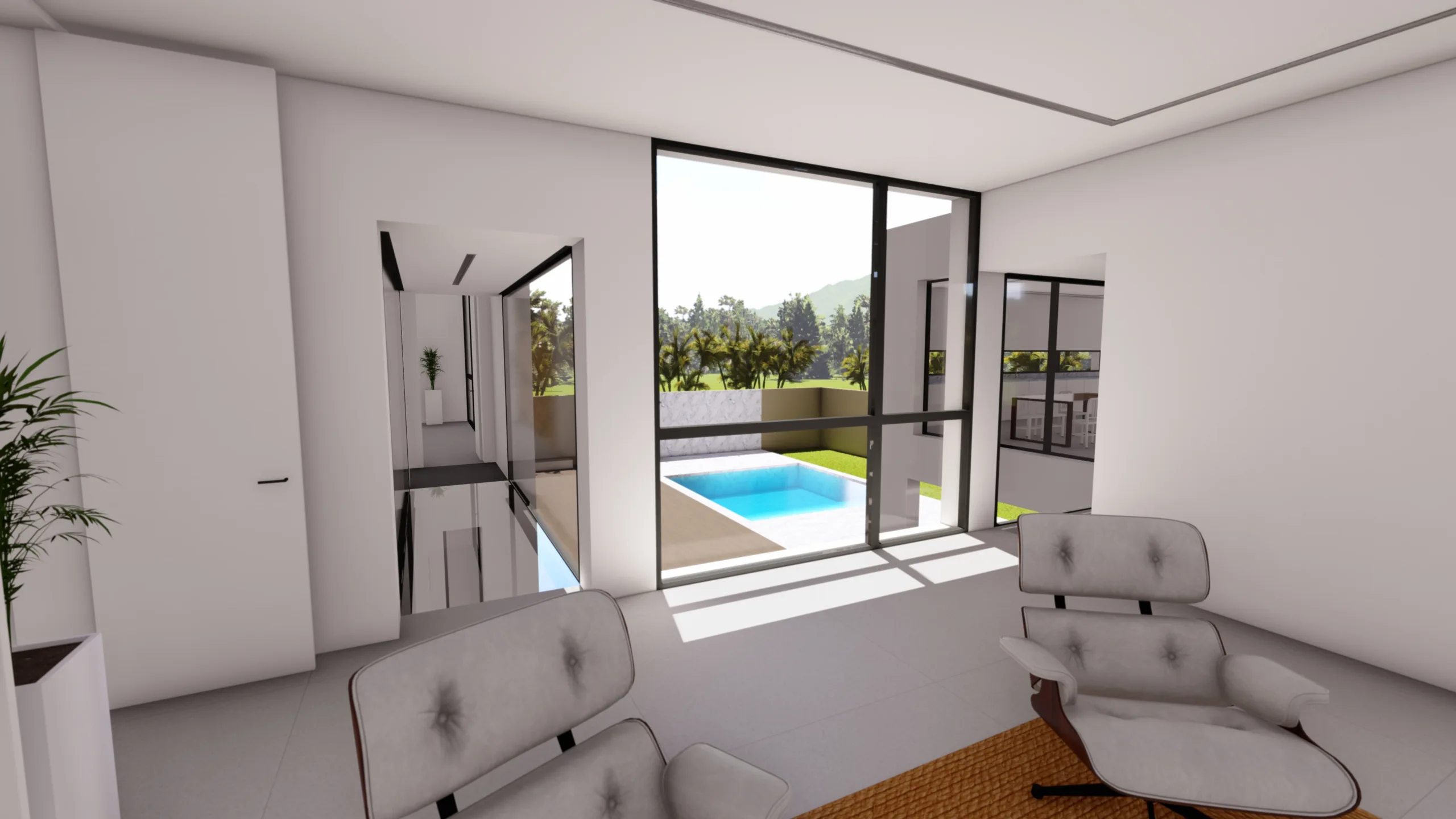 El tercer cubo es pura transición: un porche cubierto y abierto en tres de sus caras invita a extender la vida hacia el jardín y la piscina, acompañado de un aseo lateral discreto.